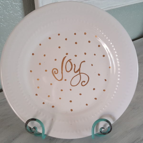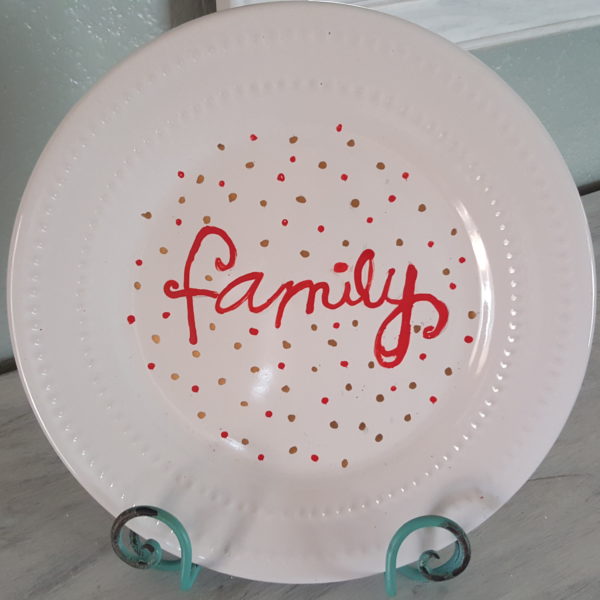 Product DescriptionWhite ceramic plates decorated with dots and sayings, such as "Family", "Joy", and "Faith - Hope - Love". Each plate is 11 inches in diameter. Product Gallery