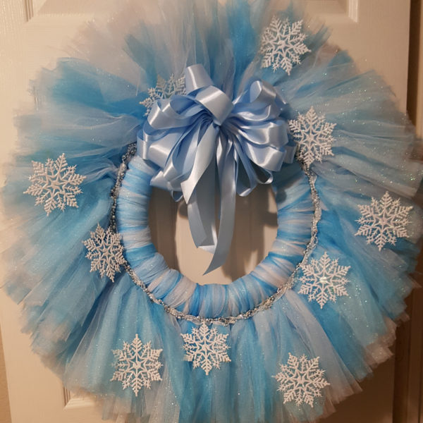 Product DescriptionThis wreath is comprised of pale blue and white tulle with a pale blue bow and snowflake accents around the wreath