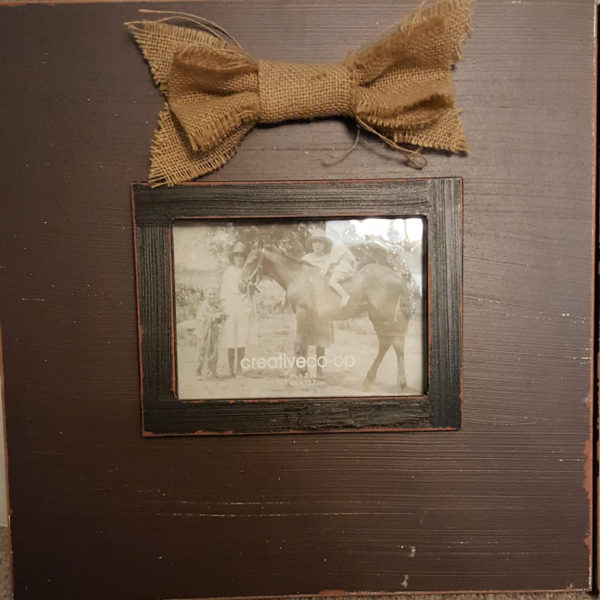 Product DescriptionA black rustic picture frame with a burlap bow centered across the top. Dimensions are 15.75 x 15.75